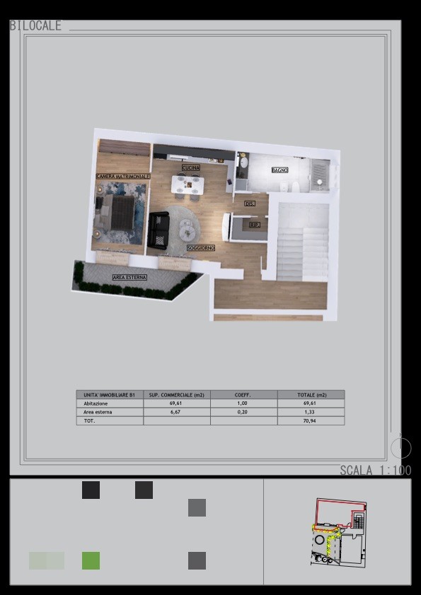 In posizione centrale e servita, proponiamo bilocale di nuova costruzione al piano terra, con piccola area esterna privata perfetta per momenti di relax, pranzi all'aperto.